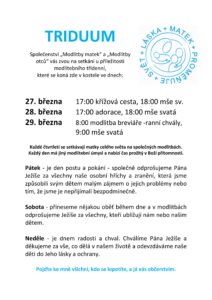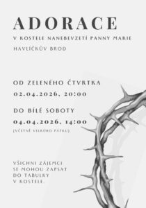 Přijměte pozvání k velikonoční adoraci v kostele Nanebevzetí Panny Marie v Havlíčkově Brodě. Kdybyste věděli o farnosti, kde mají přes svatý týden kostel zavřený, můžete dát přes plakátek info, že mohou zájemci adorovat v HB. Více informací je na přiloženém plakátku.